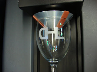 Stafford 349, SEED Center (Stafford Entrepreneurship and Economic Development Center), is utilizing the laser engraver to etch graphics and/or text on glassware. This picture shows a brand laser etched on a goblet.
